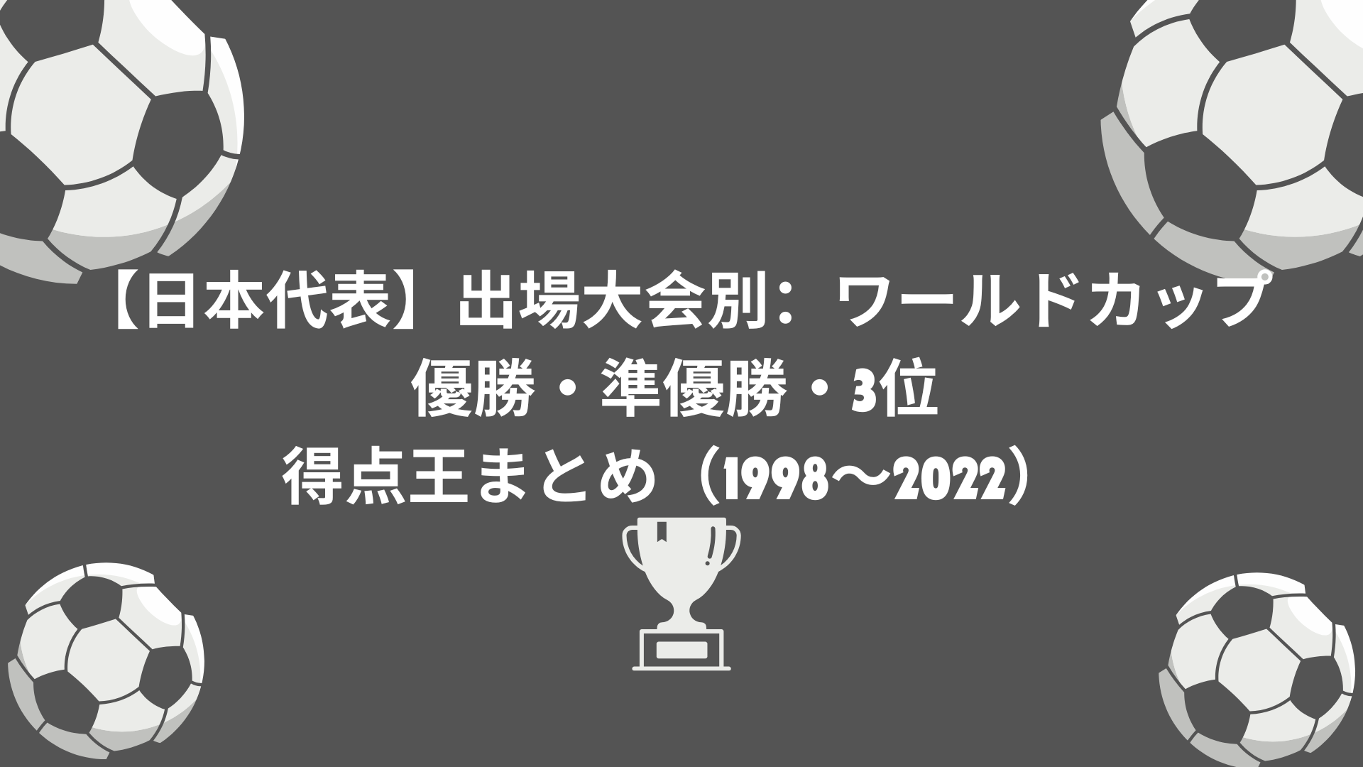 本記事では、日本が出場した各大会(1998〜2022) の「優勝」「準優勝」「3位」と、「得点王(Golden Boot)」の選手と国を一覧形式でまとめています。